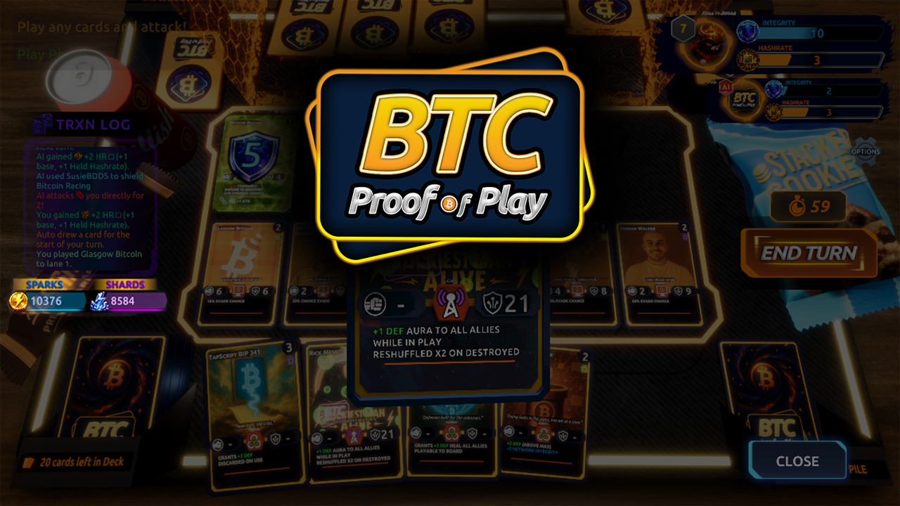 BTC: Proof of Play is a 1v1 strategy card battler built for Bitcoiners - and anyone curious enough to jump in and play. Build your deck, deploy Operators, Signals, Protocols and Artifacts, and battle with cards inspired by real Bitcoin culture, people, brands and ideas.